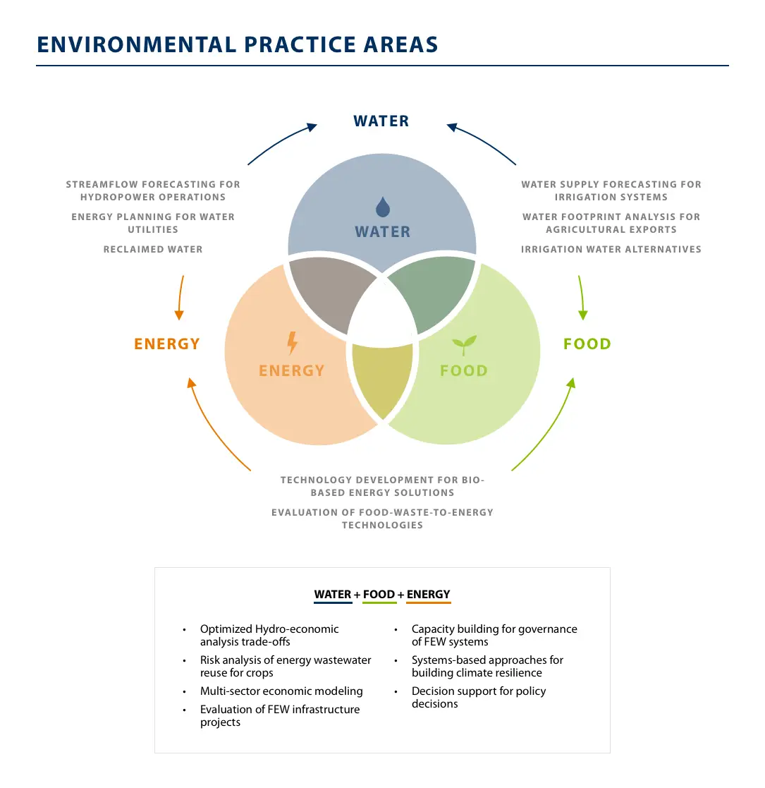We leverage our integrated technical subject matter expertise with innovative technical skills to conduct research that supports evidence-based decision-making. We work collaboratively with subject matter experts in environmental economics, natural resource management, environmental health, environmental science, water resources, food safety, food security, international resource governance, energy technology, environmental engineering, water treatment, and analytical chemistry. Our interdisciplinary experts also have a broad understanding of the juxtaposition between environmental health and natural resource challenges, as well as individual aspects of the nexus, as shown in Figure 1.