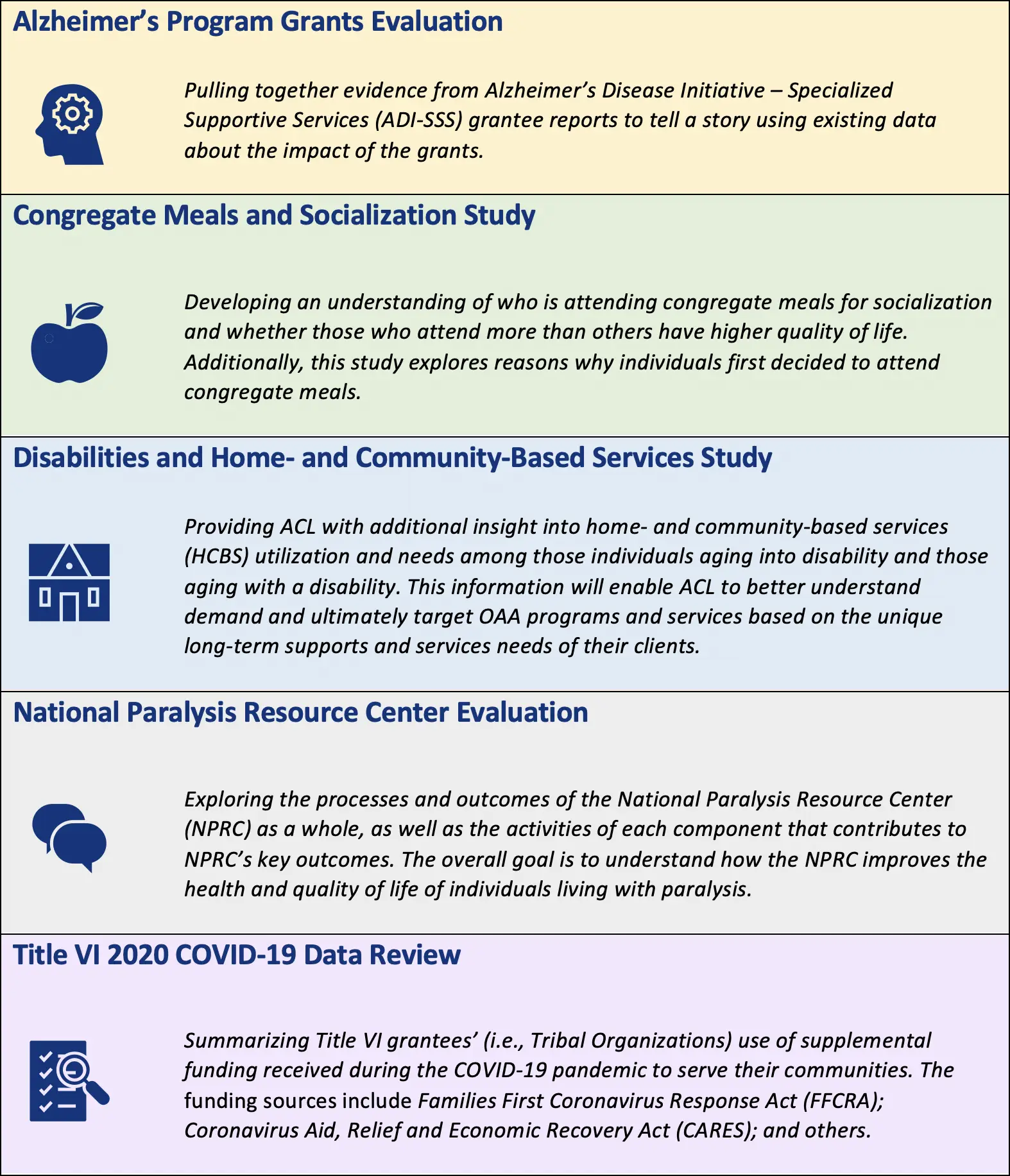 To research and evaluate several Administration for Community Living (ACL) programs that support the needs of older adults, people with disabilities, and their caregivers over a 5-year period.