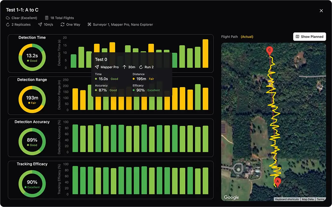 Until now, there has been no easy or objective way to compare the performance of different counter-UAS systems in real-world conditions. Evaluators often relied on vendor-provided dashboards, custom-built test tools, or disconnected spreadsheets — all of which required extensive manual workup and introduced significant bias and variability.